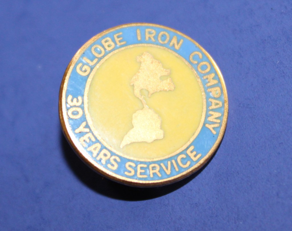 Items: 0001: Globe Iron Company store receipt book; 0002: Globe Iron Company promotional booklet; 0003: W.H. Allen Globe employee badge 1; 0004: Mayfield White Globe employee badge 167; 0047: Globe Iron 30 years of service commemorative pin.