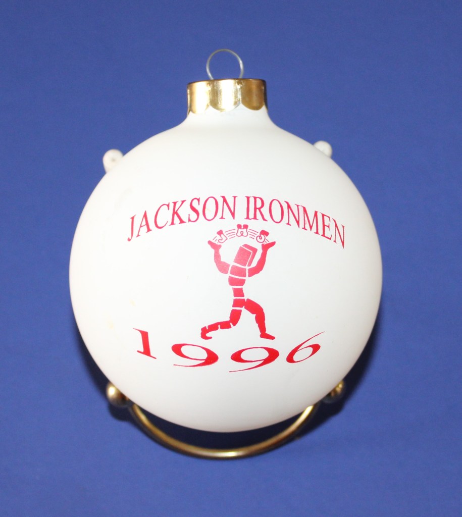 Description: This holiday ornament is the 3rd in the Memories of Jackson series and features the old Jackson Ironmen logo and the year 1996.