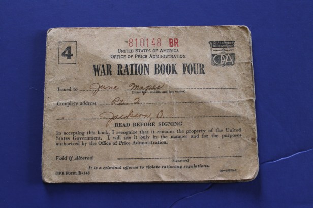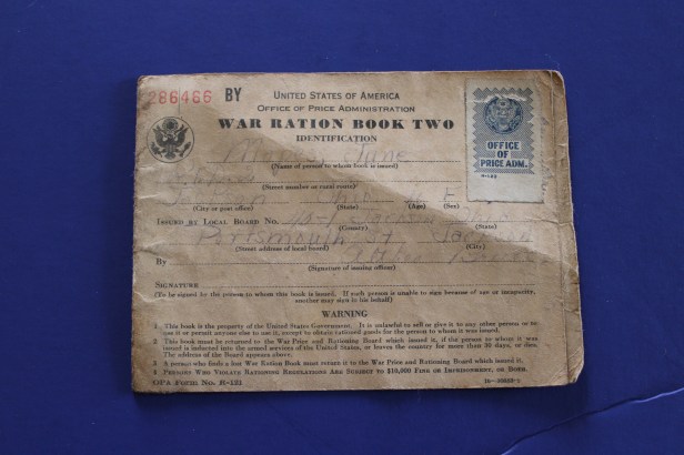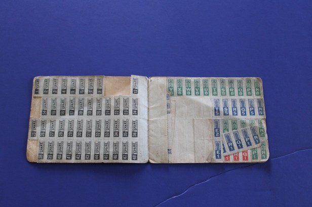 Description: Picture 1: The front of a World War II ration book four. Picture 2: The inside of the ration book showing the stamps. Picture 3: The back of the ration book. Picture 4: The front of a World War II ration book two. Picture 5: The back of the ration book two.