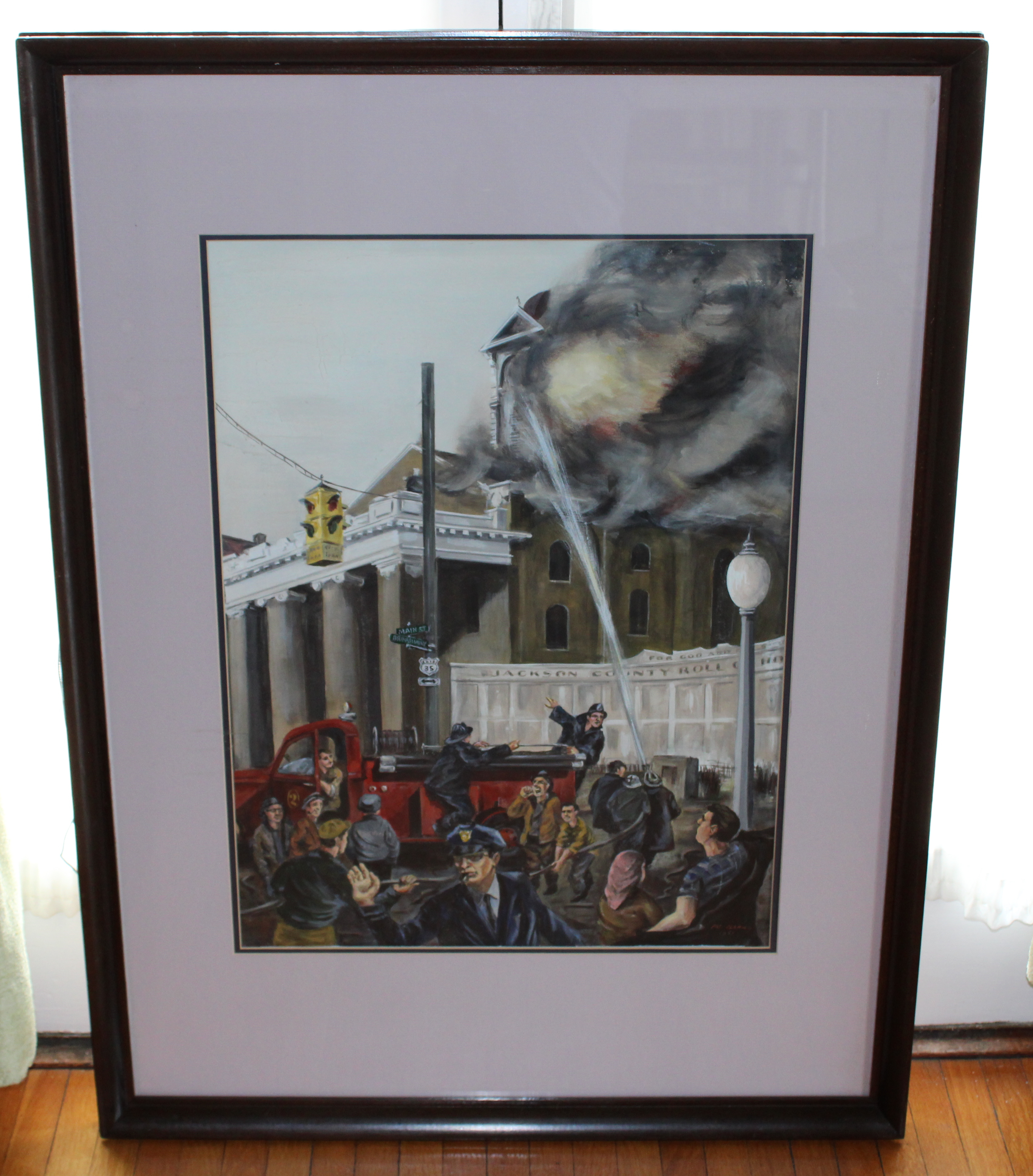 Description: The painting depicts the Jackson County Courthouse Fire that occurred on January 25th, 1951. The painting was completed by R. Patrick Clark – who grew up in Jackson on Pearl Street – when he was 22 years old.
